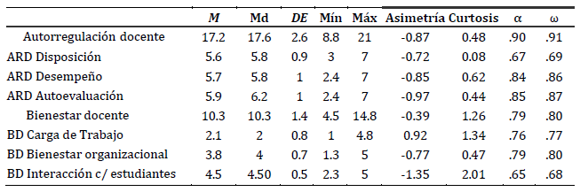 La correlaciones significativas y positivas entre autorregulación docente y bienestar docente, con su medida general y sus tres subescalas, aportan evidencia sobre la validez convergente (Tabla 5).