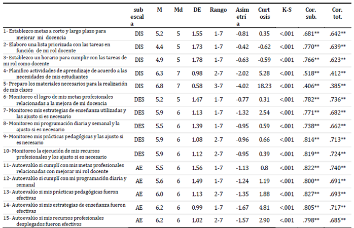 Nota: Cor. sub.: coeficiente de correlación (rho de Spearman) ítem-subescala; Cor. tot.: correlación ítem-escala total; DIS: Disposición para el rol docente; DES: Desempeño en el rol docente; AE: Autoevaluación en el rol docente. ** p < .001