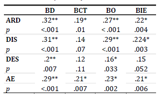 En general, como se observa en la Tabla 3, los ítems se comportan de forma aceptable a buena, con medias algo superiores a la media de la escala y desvíos estándar superiores a 1 (Carretero-Dios & Pérez, 2005). Su distribución no se comporta como normal. Todos los ítems superan el valor .30 de correlación con la escala total. Los ítems 4 y 5 correspondientes a la subescala de disposición presentan menor variabilidad de respuestas, los valores más bajos de correlación con la subescala y escala total.