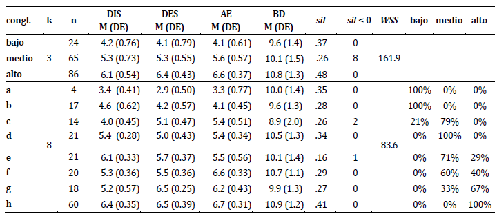 Nota: congl: Conglomerado. DIS/DES/AE/BD M (DE): Media y Desviación Estándar de cada conglomerado en la escala de BD y las subescalas de ARD. sil: coeficiente de silueta. sil < 0: sujetos con coeficiente de silueta menor a 0. bajo/medio/alto: para cada conglomerado con k = 8, el porcentaje de sujetos asignados al perfil bajo, medio y alto nivel en k = 3.