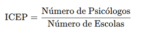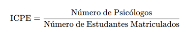 Gonçalves et al. (2025) adotam um interessante índice para averiguar a inserção de psicólogos escolares e educacionais na rede pública de educação, calculando a quantidade de profissionais por matrícula de estudantes. Neste estudo, nomearemos tal indicador como Índice de Cobertura em Psicologia Escolar e Educacional (ICPE), conforme se verifica na Equação 1. Representa a quantidade de psicólogos por estudante na rede pública. Quanto maior esse valor, maior a cobertura de profissionais.