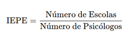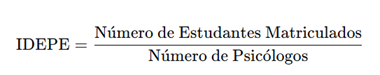 Na Bahia, no período pesquisado, o ICPE correspondia a 0,0000785, o que representa aproximadamente 1 psicólogo para cada 12.727 estudantes. Esse segundo dado se refere ao que nomearemos, neste estudo, de Índice de Demanda Estudantil por Psicólogo Escolar (IDEPE; Equação 2). O IDEPE representa a razão entre o número de estudantes matriculados pelo total de psicólogos no universo pesquisado. Indica, portanto, quantos estudantes há para cada psicólogo atuando na rede pública de educação. Quanto menor esse valor, mais favorável é a proporção para um atendimento adequado.