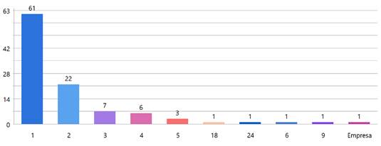 Excluindo aqueles municípios que não apresentaram dados sobre psicólogos escolares e educacionais, a maior parte (59 %, N= 62) possuía apenas um profissional correspondente aos critérios desta pesquisa. A Figura 1 mostra essa distribuição, constando no Eixo X o número de psicólogos, e no Eixo Y o número de municípios com determinada quantidade de psicólogos.