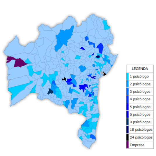 Os destaques foram Salvador (24 psicólogos), Serrinha (18 psicólogos), Guanambi (9 psicólogos) e Laje (6 psicólogos). Três municípios contam com 5 profissionais: Caldeirão Grande, Ibicoara e Jequié. Seis municípios apresentaram dados sobre 4 psicólogos na rede pública de educação: Amargosa, Barra da Estiva, Itapitanga, Retirolândia, Tucano e Ubaitaba. Demais municípios apresentaram três ou menos profissionais.