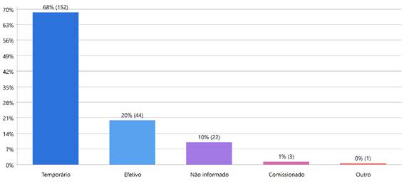 Quanto às modalidades de contratação dos profissionais, os dados revelam um número baixo de realização de concursos públicos para psicólogos educacionais. A maioria (68 %) das contratações é feita de forma temporária, o que prejudica a igualdade de oportunidades no processo seletivo para esses profissionais, além de impedir o estabelecimento de vínculos duradouros com o trabalho e com o público de intervenção, bem como o desenvolvimento de uma carreira no serviço público. A Figura 3 retrata o cenário descrito. Destaque para Salvador, com todos os 24 servidores identificados no portal da transparência como efetivos.