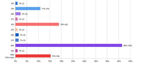 Quanto à carga horária de trabalho dos psicólogos escolares e educacionais na rede pública de educação pesquisada, os dados exibidos na Figura 4 sugerem um padrão de cumprimento de 40 horas semanais (46 %, N= 103). Há, ainda, 42 profissionais (19 %) trabalhando 30 horas semanais, carga horária de referência, pois tramita no Congresso Nacional o Projeto de Lei 1.214/2019, que visa estabelecer a jornada de trabalho de 30 horas semanais para psicólogos.