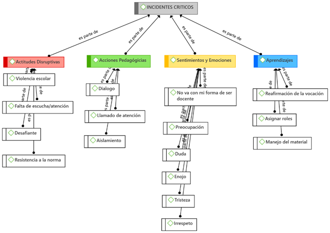 El análisis de los incidentes críticos recopilados durante la práctica pedagógica de énfasis escolar permitió identificar cuatro categorías principales en la construcción de la IPD (Figura 1).