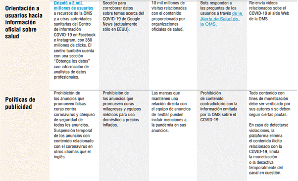 Facebook, Google, LinkedIn, Microsoft, Reddit, Twitter y YouTube manifestaron públicamente su compromiso para combatir la desinformación ligada a la pandemia (Redacción El Mundo, 17 de marzo de 2020). De acuerdo al informe Periodismo, libertad de prensa y COVID-19 de la UNESCO (2020), dentro de las estrategias que tomaron pueden distinguirse: a) aquellas relativas a la moderación de contenido, esto es: la eliminación, etiquetado o clasificación descendente de las desinformaciones relativas al COVID-19; b) la redirección de los usuarios hacia fuentes de información oficiales en los resultados de sus búsquedas, a través de acuerdos con organismos nacionales e internacionales de salud como la OMS/Organización Panamericana de la Salud (OPS); y c) la prohibición, en sus políticas de publicidad, de anuncios publicitarios que incluyeran desinformaciones vinculadas al Coronavirus; entre otras. Aquí se hará foco, especialmente, en las dos primeras; no obstante, la siguiente Tabla 1, elaborada por la UNESCO (2020), se considera elocuente para ilustrar las estrategias más importantes adoptadas por las plataformas en el contexto de la pandemia.