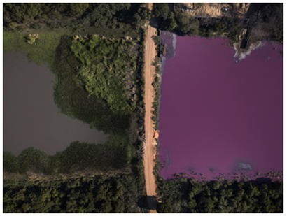 La fotografía de Sáenz tomada con un dron a 150 metros de altura muestra una composición geométrica que actúa por oposición. Permite ver simultáneamente lo que sucede en las dos áreas en las que está dividida la laguna. El fotógrafo abrió el encuadre y amplió la capacidad de observación. El ángulo de visión que permite el dron no lo tendría un espectador ni aun estando en el lugar de los hechos. De modo simple y contundente, la fotografía permite observar el conflicto a través de llamativos colores. El color magenta produce curiosidad, llama la atención, otorga un halo de misterio a la imagen. Al mismo tiempo, la fotografía es evidencia y se transforma en prueba de un delito.