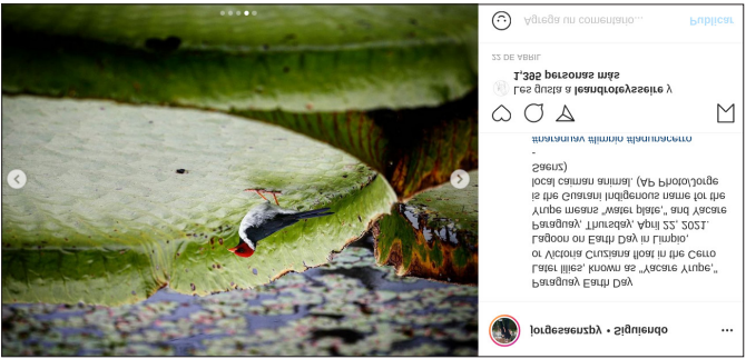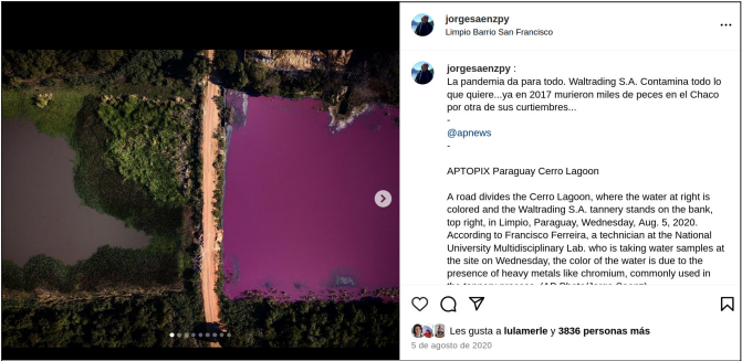 Ese mismo día envió una de estas imágenes a través de la agencia AP a sus suscriptores (los diarios Washington Post y New York Times y diarios europeos como El País, Le Monde, entre otros). El fotógrafo también publicó la fotografía, junto con otras, en su cuenta de Instagram y en su Facebook personal con el texto: “La pandemia da para todo... Waltrading contamina todo lo que quiere, ya en el 2017 murieron miles de peces en el Chaco por otra de sus curtiembres” (Imagen 2). Su posteo llegó a más de 3800 personas.