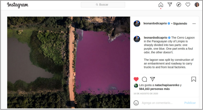 En el caso analizado, el rol de Di Caprio fue central para torcer esa desigualdad. Diarios paraguayos y de otros países se hicieron eco de la noticia de la contaminación de la laguna a partir de su posteo4. Como se sabe, el uso de celebridades que gozan de popularidad es una estrategia publicitaria de larga data. La efectividad de esos “apadrinamientos” depende de la valoración del personaje público en cuestión, de la identificación que genera, de la admiración y el respeto que despierten. En términos publicitarios, el uso de personajes populares promueve un rápido reconocimiento de un producto, aumenta el atractivo y el deseo, puede mejorar la actitud hacia una marca y la difusión boca a boca. Dependiendo del personaje en cuestión, puede tener un impacto positivo; es decir, permite una transferencia de significados y de atributos de la celebridad a la marca, tema, producto o servicio asociado, así como la atracción del personaje puede hacer posible un rápido llamado de atención, mucha más si la valoración que se tenga de la celebridad o personaje se transfieren al mensaje dado o reproducido.