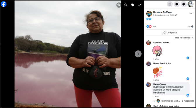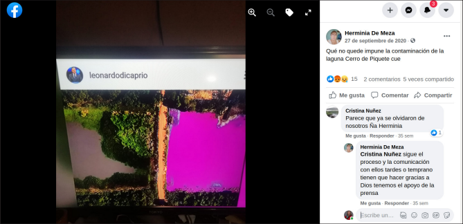 A raíz de la repercusión mediática que tuvo la publicación de Di Caprio en medios y redes sociales de Paraguay, los vecinos y las vecinas de Limpio volvieron a manifestarse. Esta vez cortaron el tráfico de camiones areneros que trabajaban en el camino que separa las dos partes de la laguna, confeccionaron carteles que pegaron al costado del terraplén y colocaron una hilera de cruces con crespones negros. También se hicieron una remera con una de las fotos de Sáenz y la inscripción “Yo soy defensor de la laguna Cerro”. Herminia Valdez de Meza (a partir de ahora, Doña Herminia) se puso la remera y con la laguna contaminada a su espalda se sacó una foto que publicó en su Facebook personal donde obtuvo 106 interacciones, un porcentaje considerablemente mayor al que venía teniendo antes de que el actor se involucrase en el tema (Imagen 5). También sacó una foto del posteo del actor y la publicó en su Facebook para dar cuenta de la legitimidad que había obtenido su reclamo. En ese marco de interacción, una vecina le comenta que “Parece que ya se olvidaron de nosotros” y Doña Herminia ella contesta: “sigue el proceso… tenemos el apoyo de la prensa” (Imagen 6).