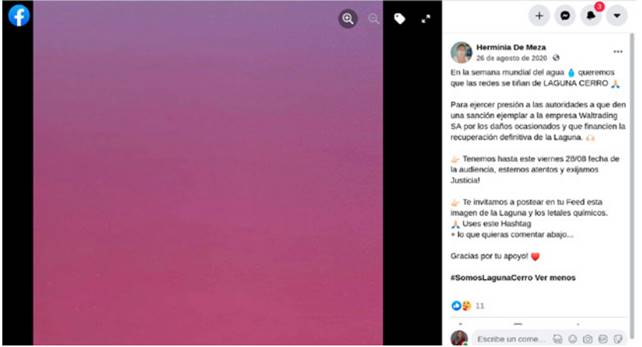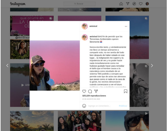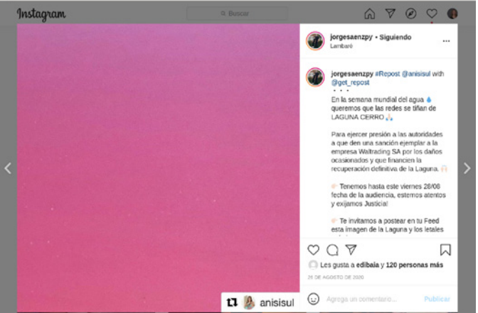 A fines de agosto se sumó a la campaña de visibilización una instagramer paraguaya, @anisisul, que fue hasta el lugar, hizo un vivo de Instagram desde allí que tuvo 325.229 reproducciones y convocó a poner en las redes, en la Semana Mundial del Agua, un cuadrado de color magenta. La consigna de la esta acción magenta era que las redes se tiñeran del color del agua contaminada. Doña Herminia, Jorge Sáenz y otros miles de usuarios de redes se sumaron a esa convocatoria (imágenes 7, 8 y 9).