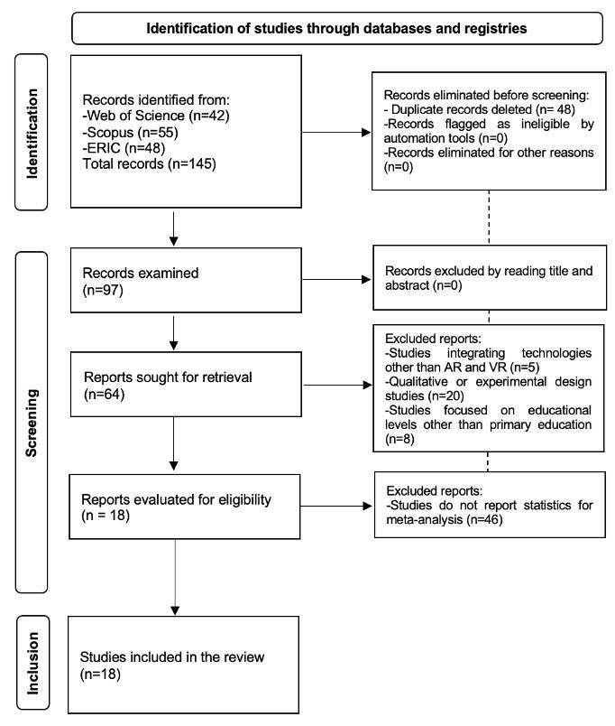 The inclusion criteria comprised quantitative studies with an experimental design that used AR or VR technologies and focused on primary education. Conversely, the exclusion criteria led to the removal of studies with qualitative or non-experimental designs, those employing technologies other than augmented or virtual reality, and those focusing on educational levels other than primary education. Additionally, studies that did not report statistics required for meta-analysis, such as mean and standard deviation, were excluded.