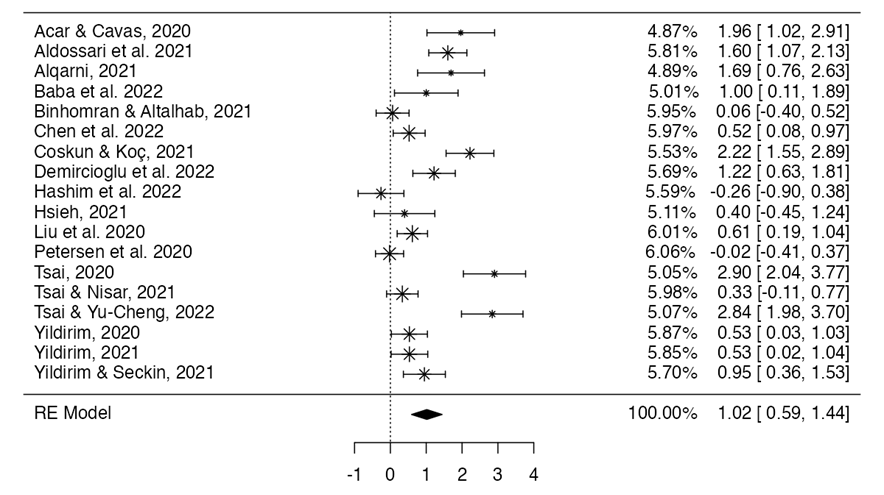 Table 5presents the results of the random-effects model for the 18 studies. The analysis estimates a large effect size of 1.02 (Sawilowsky, 2009). However, due to variability across studies, the true population effect may range from 0.591 to 1.443, with a 95% confidence interval.