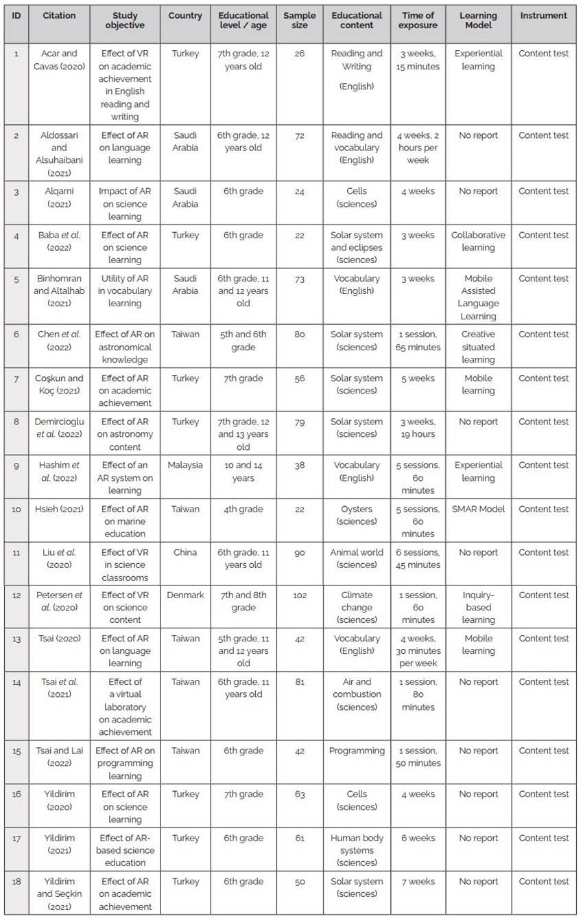 Regarding the age of the participants, the studies were conducted with students aged 11 and 12, corresponding to sixth and seventh grades. At this stage of cognitive and psychosocial development, students are undergoing changes in how they think, process information, and understand the world, as well as in how they interact socially (Erikson, 1985; Piaget, 1974). The visualization features of AR and VR can have a significant impact on students' learning and development at this age, due to several factors identified in the literature: the exploration of concepts and scenarios in an interactive way; increased engagement in learning, as they are at an age when interest may fluctuate due to personal and contextual factors; development of cognitive and social skills; and sensory stimulation that supports different learning styles (Akçayır & Akçayır, 2017; Hamilton et al., 2021; Villena-Taranilla et al., 2022).