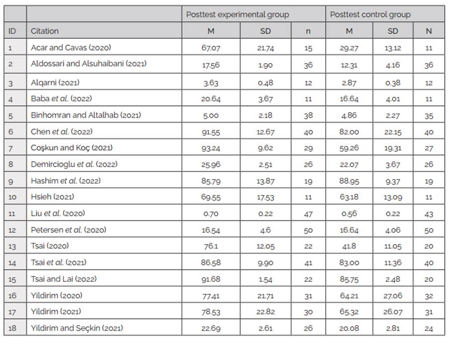 To extract information from the 18 articles, a protocol was established that included the following elements: ID, citation, study objective, country, age, educational level, sample size, educational content, duration of exposure to technology, learning model, instrument to measure learning, and descriptive statistics. The principal investigator performed the initial extraction of information, collecting the relevant data from each article according to the established protocol. The rest of the team then reviewed and verified the extraction to ensure the consistency and accuracy of the data. Table 1 2, 4, 5, 8, 13, 15, 24, 30, 38, 40, 47, 49, 51, 54, 55, 56, presents the extraction matrix with the information associated with each study. The results from this table will be presented to answer RQ1.