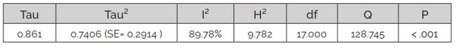 Table 3presents the results of the heterogeneity test, showing significant heterogeneity among the 18 studies (Q(17)=128.745, p<0.0001), considerable variability among the effects of the individual studies (tau²=0.7406) and observed variability (I²=89%), suggesting that the studies originate from different populations.
