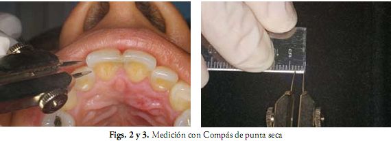 Se presentó una hoja informativa a los pacientes, padres y/o tutores de los procedimientos y objetivos del trabajo. Seguidamente se procedió a la aplicación del DAI, en el cual se analizaron las diez variables establecidas por el índice, relacionadas con la dentición, el espacio y la oclusión. Todos los registros clínicos fueron realizados por un único examinador, calibrado y entrenado a tal efecto, las variables que se expresan en milímetros se midieron con sonda milimetrada (Fig. 1) y luego con compás de punta seca en el mismo paciente (Figs. 2 y 3), de forma alternada, trabajando con dos pacientes a la vez, al primer paciente se le tomó las medidas con sonda milimetrada, para luego tomarlas en el segundo paciente alternando el instrumento de medición, es decir con compás de punta seca, luego se tomaron las mismas medidas en el primer paciente con compás de punta seca y en el segundo con sonda milimetrada, dejando pasar un tiempo de 15 minutos entre cada registro.