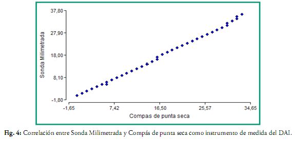 Se evaluó a través del Índice de Correlación de Pearson, la puntuación final del DAI, calculado a partir de mediciones realizadas con sonda milimetrada y compás de punta seca, donde se observó una alta correlación entre los valores resultantes de ambos instrumentos, se corrobora con un r= 0,999, p valor= 0,000 (Fig. 4).