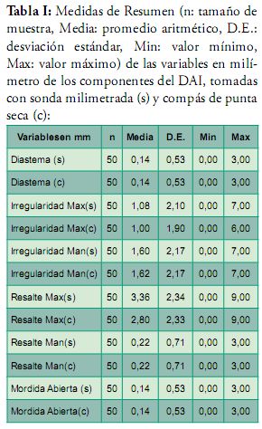 En los 50 pacientes evaluados, se observaron las variables medidas en milímetro de los componentes del DAI tomados por ambos instrumentos, destacando que la mayor variabilidad se registró en la medición del resalte maxilar, con una media de 3,36 mm, tomada con sonda milimetrada y 2,8 mm, con compás de punta seca, presentando una diferencia de 0,56 mm entre ambos instrumentos(Tabla I).