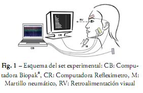 Se realizó el examen clínico general, regional y local de los voluntarios con la finalidad de verificar los criterios de inclusión-exclusión. Una vez incluido en el estudio, se procedió a explicarle al voluntario la metodología de trabajo. Se utilizaron dos sistemas de registros electromiográficos en forma paralela: en primer lugar se utilizó un reflexímetro que permite retroalimentación visual a tiempo real de la actividad contráctil muscular. En segundo lugar se utilizó un sistema de registros electromiográficos de 8 canales (Biopak®) para tener información de los músculos inervados por tres pares craneales diferentes en forma simultánea. Se estandarizó el funcionamiento del sistema y el set experimental de acuerdo a cual músculo retroalimentaba la información visual relacionada a la trayectoria de la actividad motora. Este set experimental es automático y permite al individuo controlar la trayectoria de la fuerza muscular en tiempo real a través de biofeedback visual (Fig. 1). El reflejo inhibitorio que se obtuvo por estímulo en el mentón corresponde al territorio trigeminal pero la retroalimentación visual era controlada por músculos de tres pares craneanos distintos. De este modo, se utilizaron tres sets para capturas electromiográficas de tres músculos inervados por pares craneales diferentes, uno por cada músculo, el cuál generaba la retroalimentación visual. Se midió en cada registro, el tiempo que cada individuo necesitaba para controlar la trayectoria de la fuerza hasta que una serie de condiciones estandarizadas se cumplieran. Los tiempos fueron registrados en una planilla diseñada para cada paciente.