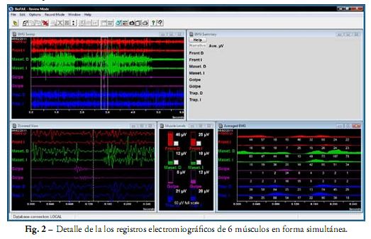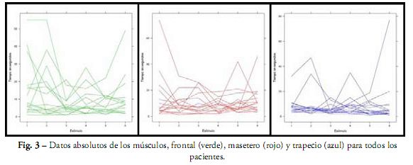 La ubicación de los electrodos descartables BioEMG (Biopak®) se realizó con los siguientes criterios: para el músculo masetero se colocó el electrodo sobre el haz superficial del mismo siguiendo el eje del músculo. Para el músculo trapecio se ubicó en la porción superior del músculo, siguiendo el eje de las fibras, y en el músculo frontal se colocó el electrodo siguiendo el eje del músculo.