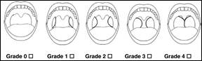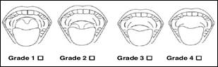 The tonsils are assessed according to the degree of obstruction of the oropharynx, on a scale of 1 to 4. This is a reliable clinical evaluation method (Fig. 3). In Grade 1, the tonsils are within their cavity; in Grade 2, they do not exceed the midline between the uvula and the anterior pillar of the soft palate; in Grade 3, they go over the midline between the uvula and the anterior pillar; and in Grade 4, the tonsils are less than 4 mm between them. A degree of obstruction Grades 3 or 4 represents a decrease in airway permeability12.