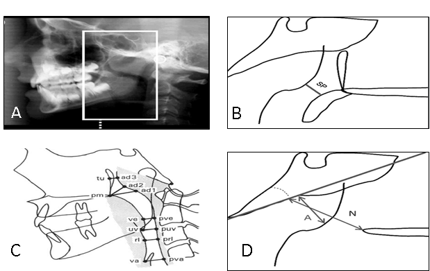 In 1984, McNamara stated that there is obstruction of the airway if there is a distance lower than 5 mm. Between the nearest points of the posterior wall of the nasopharynx and of the soft palate (Figure 5B). In 1979, Fujioka et al. described the adenoidal-nasopharyngeal ratio (AN ratio), which relates the length of the line perpendicular to the sphenoid bone (A) by the thickest portion of the adenoids with the distance between the posterior nasal spine and the anterior edge of the sphenobasioccipital synchondrosis (N). An AN <0.8 is considered normal and an AN >0.8 is considered enlarged (Fig. 5D). In addition, Feres, Murilo et al. in 2012 found that both parameters had good reproducibility and a variability which was not clinically significant.