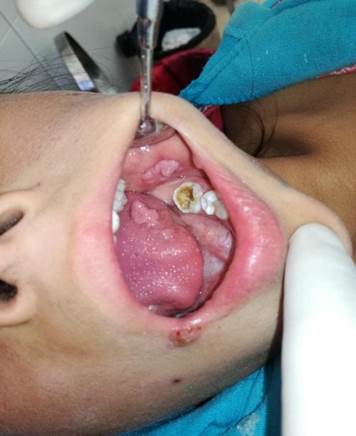 A 9-year-old girl sought care accompanied by her father. She was reluctant to be examined, inhibited, and distant towards the professionals. The patient reported that she had had some painless lesions in the oral cavity for approximately two years without apparent cause, and the lesions caused her discomfort when chewing.