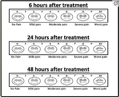 Cada paciente puede clasificar el dolor en un cuestionario de Visual Analog Scale (VAS) de la siguiente manera: 0, sin dolor; 1-3, dolor leve; 4-6, dolor moderado; 7-9, dolor intenso; y 10, el peor dolor 29. (Fig. 1)