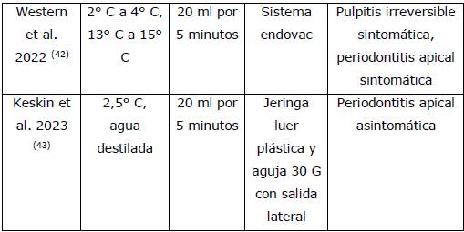 Hasta el momento no hay un protocolo específico clínico en referencia a la temperatura ideal del irrigante, cuál sería el más indicado y el tiempo de aplicación. Resulta ser un método de fácil aplicación con pocas contraindicaciones, no tóxico y que no demanda inversión económica significativa de parte de los profesionales.