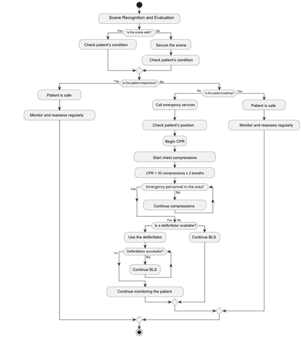 Basic life support or cardiopulmonary resuscitation is a treatment algorithm for the initial management of medical emergencies, with cardiorespiratory arrest being the most severe6. This algorithm is indicated for patients with loss of consciousness, no sensory response to stimuli, loss of protective reflexes, and inability to maintain a patent airway, as it helps maintain blood perfusion to vital organs3. When the response to the evaluation of vital signs is altered or absent, the emergency chain should be activated by calling medical services to the scene as soon as possible. According to the American Heart Association and its guidelines, the algorithm for evaluating and treating cardiorespiratory arrest consists of P (Position), which involves placing the patient in a supine position, aligning the heart and brain on the same axis, with the feet slightly elevated (10° to 15°); C (Circulation), which assesses blood perfusion by monitoring heart rate and blood pressure; A (Airway), which evaluates airway patency, performs maneuvers to improve ventilation (such as chin lift or jaw thrust), and uses devices if necessary (such as oro- or nasopharyngeal airways); B (Breathing), which checks for the presence and pattern of breathing, and provides supplemental oxygen and ventilatory support if needed; and D (Definitive Management), where, after evaluating the above parameters, the attending physician must decide on the definitive management required for the situation7. Additionally, it is recommended not to delay BLS for more than 10 seconds, as most DMEs are resolved by applying it, with pharmacological management being secondary. Figure 1
