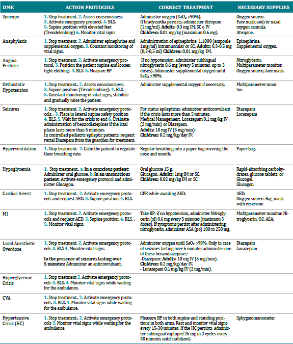 When a DME occurs, dentists must have the knowledge and skills to resolve them. According to Lawson et al.5 a lack of theoretical knowledge will hinder the practical performance of each DME, potentially increasing patient morbidity and mortality. DMEs may have both unique and shared characteristics, which is why accurate assessment and effective diagnosis will allow a better approach to the emergency and its treatment. In case of a DME, the initial measure is to suspend dental care immediately and to seek immediate medical attention. Provisionally, there are some initial actions that the dentist should be aware of, as well as having some of the necessary supplies for a first response1. However, the best way to deal with this type of event is prevention, by performing a complete preoperative clinical evaluation to define the patient's risk and thus prevent a possible DME. This paper describes the most frequent DMEs, the procedures, supplies and actions required by the dentist for initial management, resolution and, if necessary, referral to a hospital center.