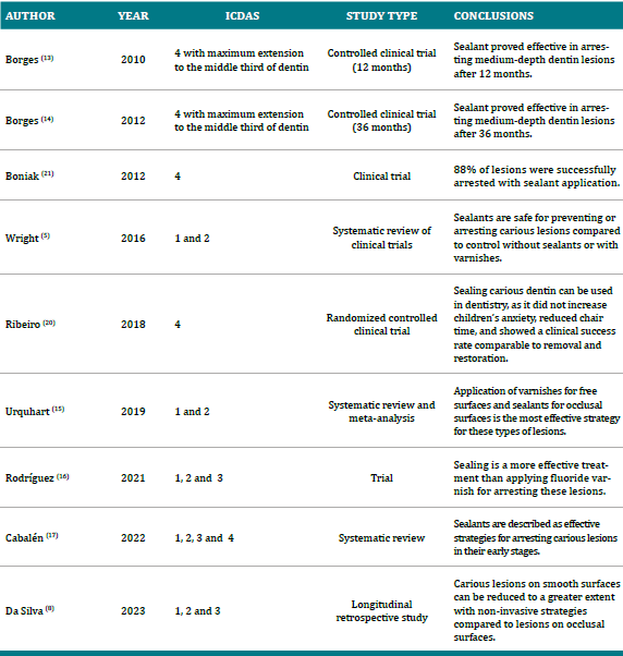 Table 1. Comparative table of published studies by author, year, ICDAS code, study type, and conclusions
