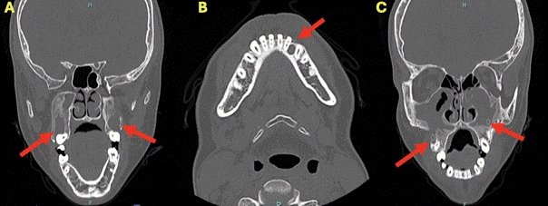 Figura 1. Tomografía computarizada del año 2021, se evidencian tres lesiones hipodensas señaladas con una flecha roja. (A) Dos lesiones hipodensas bilaterales de apariencia quística ubicadas en relación a ambos senos maxilares. (B) Presencia de lesión hipodensa de apariencia quística en zona parasinfisiaria izquierda. (C) Cánulas instaladas en ambas lesiones maxilares.