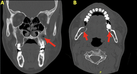 Figura 2. Tomografía computarizada tomada en el Servicio de Urgencias, evidenciando tres lesiones hipodensas señaladas con una flecha roja. (A) Lesión hipodensa de apariencia quística ubicada en zona maxilar izquierda que se encontraba sobreinfectada, correspondería a la recidiva de lesión tratada en 2021. (B) Lesiones hipodensas de apariencia quística ubicadas en ambos ángulos mandibulares, lesiones que no se encontraban el 2021.