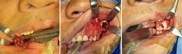 Bajo anestesia general, con intubación orotraqueal, los quistes fueron enucleados con osteotomía periférica con la posterior aplicación de SCM en las superficies no críticas de los lechos quirúrgicos, alejadas de la órbita. Tras el procedimiento, acude a control los primeros 6 meses para luego no concurrir por dos años.