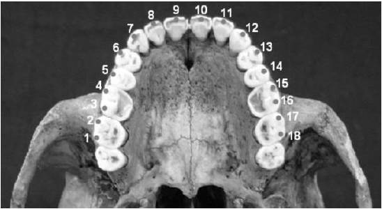 Figura 1: Hitos (landmarks) anatómicos utilizados en el presente estudio para registrar la forma del arco dentario superior (Definición en Tabla 1).