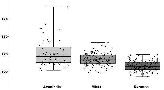 Análisis del tamaño del centroide: Los individuos de ancestría amerindia presentaron el mayor tamaño del centroide promedio (126.50 ± 18.36 mm.), seguido por el mixto (117.32 ± 8.58 mm.) y el europeo (108.03 ± 7.10 mm.). La prueba de Kruskal-Wallis (H= 80.28, p= 3.694e-18) y el test post-hoc de Dunn con corrección de Bonferroni mostraron diferencias estadísticamente significativas entre la forma del arco dentario de amerindios y europeos (p= 5.704e-15), y de mixtos y europeos (p= 2.488e-12), aunque no así de mixtos y amerindios (p= 0.067) (Figura 4).