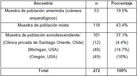 Se realizó un estudio observacional, analítico de tipo transversal para comparar la forma y tamaño de los arcos dentarios entre individuos de diferentes ancestrías. La ancestría amerindia contó con muestras de poblaciones precolombinas del Centro Sur Andino y del Centro, Sur y Extremo Sur de Chile, cuyos sitios arqueológicos se distribuyen en un rango temporal que va desde los 7.500 años de antigüedad (Cultura Chinchorro) hasta el contacto con el español . Este material se encuentra depositado en el Centro de Análisis Cuantitativo en Antropología Dental de la Facultad de Odontología de la Universidad de Chile representado por una colección de fotografías en norma anatómica de cráneos cuyo registro se realizó en terreno por GM y AD entre los años 2008 y 2014 en la Corporación de Cultura y Turismo de Calama, Chile, el Museo Arqueológico R. P. Gustavo Le Paige, U. Católica del Norte, Arica, Chile, el Museo Nacional de Historia Natural, Santiago de Chile, y el Musée de l'Homme (Muséum national d'Histoire naturelle), París, Francia. La muestra mixta consistió en fotografías de modelos dentales obtenidos de impresiones con alginato provenientes de donaciones anonimizadas de pacientes de la Clínica Odontológica de la Facultad de Odontología de la Universidad de Chile. Finalmente, la población de origen europeo estuvo representada: i) por fotografías en norma anatómica de modelos dentales obtenidos de impresiones con alginato provenientes de pacientes con uno o dos apellidos alemanes que se atienden en una clínica privada de Santiago Oriente (Comuna de Lo Barnechea), donde, según los datos obtenidos por el Proyecto Chilegenómico, el porcentaje de ancestría europea de la población residente es del 80.3%, en comparación al 54.1% de ancestría europea de la población que se atiende en Santiago Norte (Comuna de Independencia), lugar en que se ubica la Clínica Odontológica de la Facultad de Odontología de la Universidad de Chile (http://genoma.med.uchile.cl/ancestry) y ii) por fotografías en norma anatómica de modelos 3D de pacientes blancos de Michigan y Oregón, Estados Unidos de América, disponibles en el Proyecto de colecciones del Legado de crecimiento craneofacial de la Fundación de la Asociación Americana de Ortodoncia (AAOF) (https://www.aaoflegacycollection.org/aaof_home.html). De acuerdo con Bryc et al. (2015) los individuos caucásicos de este país presentan una ancestría europea promedio del 98.6% verificada mediante análisis de polimorfismos de nucleótido único autosómicos (SNPs)12. Los criterios de inclusión fueron individuos con dentición completa de segundo molar superior derecho a izquierdo. La muestra final consistió en 53 individuos de origen amerindio, 118 mixtos y 101 europeos (resumen en Tabla 1, detalles en Tabla S1).