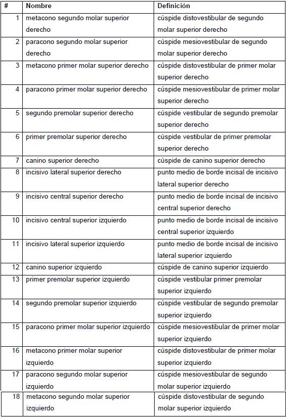 Tabla 2: Hitos anatómicos (landmarks) ubicados en las cúspides vestibulares y bordes incisales de los dientes del maxilar, utilizados para capturar la forma del arco dentario superior.