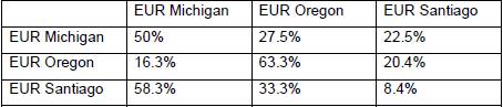 Tabla 4: Resultados del Análisis Lineal Discriminante con prueba de validación cruzada (jackknife), basada en los componentes de la forma del arco dentario de las muestras de población eurodescendiente (EUR) de EE.UU. de América y de la Clínica privada de Santiago (la estructura de esta tabla es similar a la explicada en la leyenda de la Tabla 3)