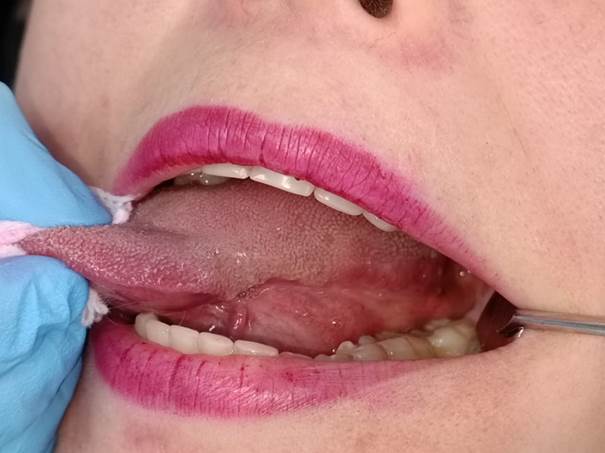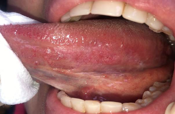 A 39-year-old female patient, allergic to metals and a vegetarian supplemented with vitamin B12, denied both smoking and alcohol consumption. She presented to the Oral Medicine Clinic at the University of Chile with a complaint of a lesion on the left lateral border of the tongue, with an 8-year evolution. She described periods of exacerbation and remission accompanied by burning sensations and reported having previously been diagnosed and treated by another professional for recurrent aphthous stomatitis, without achieving clinical resolution.
