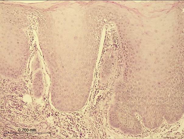 Figure 2. Histological sections of the incisional biopsy showing dysplastic epithelium with hyperplastic and acanthotic areas, chronic inflammatory infiltrate, basement membrane discontinuity, and epithelial cells occasionally invading superficially into the adjacent connective tissue within the lamina propria (Staining: hematoxylin and eosin).