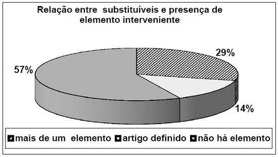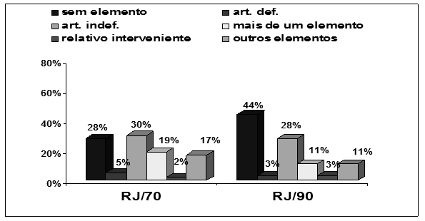 No Rio de Janeiro, na década de 90, o percentual de lexias "substituíveis" que não apresentam elemento interveniente é muito maior - passa de 28% para 44% -, como se pode verificar na Figura 3, o que sinaliza uma mudança em tempo real de curta duração, nos termos de Labov (1994). Em relação aos elementos intervenientes, não há praticamente alteração.