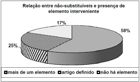 Considerando o universo de lexias não-substituíveis na fala culta de Madri, vê-se que há um salto percentual no que diz respeito às construções em que não há elementos intervenientes, o que revela um comportamento distinto do espanhol em relação ao português brasileiro. No PB, inversamente, são as perífrases que não admitem substituição por um verbo pleno as que alcançam o maior índice de não-ocorrência de itens lexicais entre o verbo e o nome. Resta por saber a que se deve essa oposição (Figura 5).
