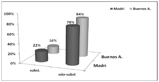 Do total de construções com verbos-suporte, apenas 22%, em Madri, e 16%, em Buenos Aires, são substituíveis, uma diferença não-significativa entre a fala madrilhena e a portenha (Figura 4 ). As construções de (39) a (42) poderiam admitir, em princípio, a substituição da lexia por um verbo pleno correlato2[2].