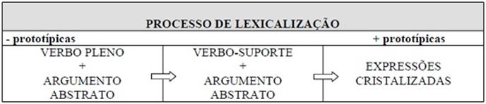 Por último, postula-se que as expressões cristalizadas constituiriam o estágio mais avançado de lexicalização, processo esquematizado no quadro 2 a seguir.