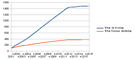 La claridad de los datos obtenidos no puede hacernos olvidar que los algo más de 152 millones de formas ortográficas contenidos en el CREA no constituyen una cantidad demasiado elevada según los tamaños que poseen en la actualidad los corpus de referencia. Es por ello de gran interés poder contrastarlos con los que proporciona ahora el Corpus del español del siglo XXI (CORPES). Al final de su tercera etapa (diciembre de 2018), el CORPES estará formado por 25 millones de formas correspondientes a cada uno de los años comprendidos entre 2001 y 2016, es decir, un total de 400 millones de formas. Para este trabajo, he procesado los datos de una versión intermedia, posterior a la publicada en abril de 2016 (la 0.83), y que consta de unos 240 millones de formas ortográficas (siempre sin cifras y anulando la diferencia entre mayúsculas y minúsculas, para conservar los parámetros con que se obtuvieron las correspondientes al CREA). Dispondremos así de la posibilidad de observar lo que sucede en un corpus que tiene casi cien millones de formas más que el CREA y, sobre todo, podremos comprobar qué es lo que cambia si pasamos de trabajar con formas a hacerlo con lemas que analizaremos en el apartado 3. En esta versión intermedia, ninguno de los años está completo y apenas se han incorporado textos orales.